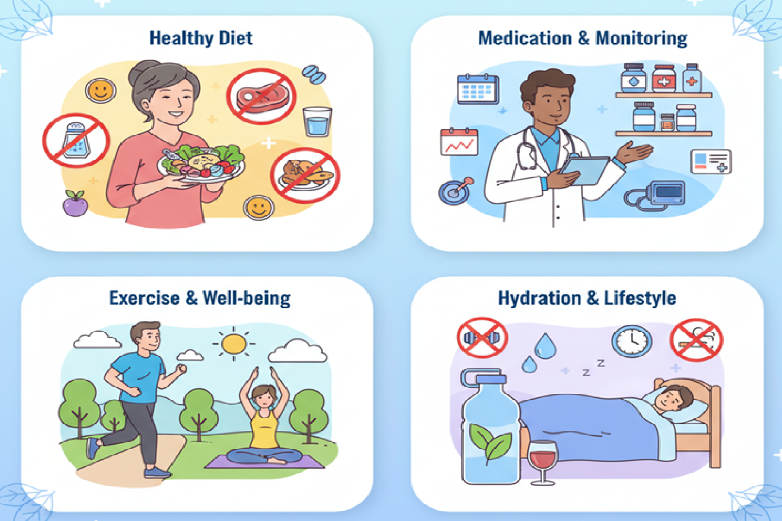 또한 정기적인 혈액검사를 통해 전해질 수치를 확인하고, 필요시 식단을 조절해야 합니다. 조리할 때는 소금 대신 허브, 향신료, 레몬즙 등을 활용하여 맛을 내고, 찜이나 구이 조리법을 많이 활용하는 것이 좋습니다.