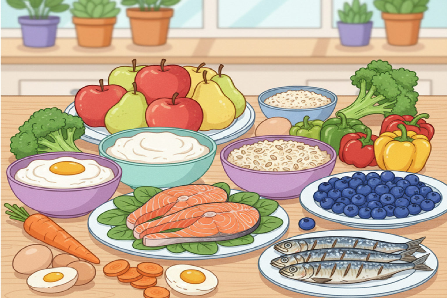 | 월 | 오트밀 + 블루베리 + 저지방 우유 | 흰살생선 구이 + 브로콜리 + 현미밥 | 두부 미역국 + 양배추 샐러드 | 오트밀: 저지방 우유와 블루베리 섞음 생선구이: 올리브오일 소량, 허브/레몬 두부미역국: 두부+미역+간장 최소 |